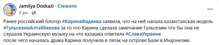 Российская блогер Карина Фадеева якобы пострадала в результате нападения казахстанской модели Гульсезим Алтайбековой в одном из ресторанов на острове Бали в Индонезии. Россиянка сделала замечание за прослушивание украинской музыки, после чего между девушками началась драка.